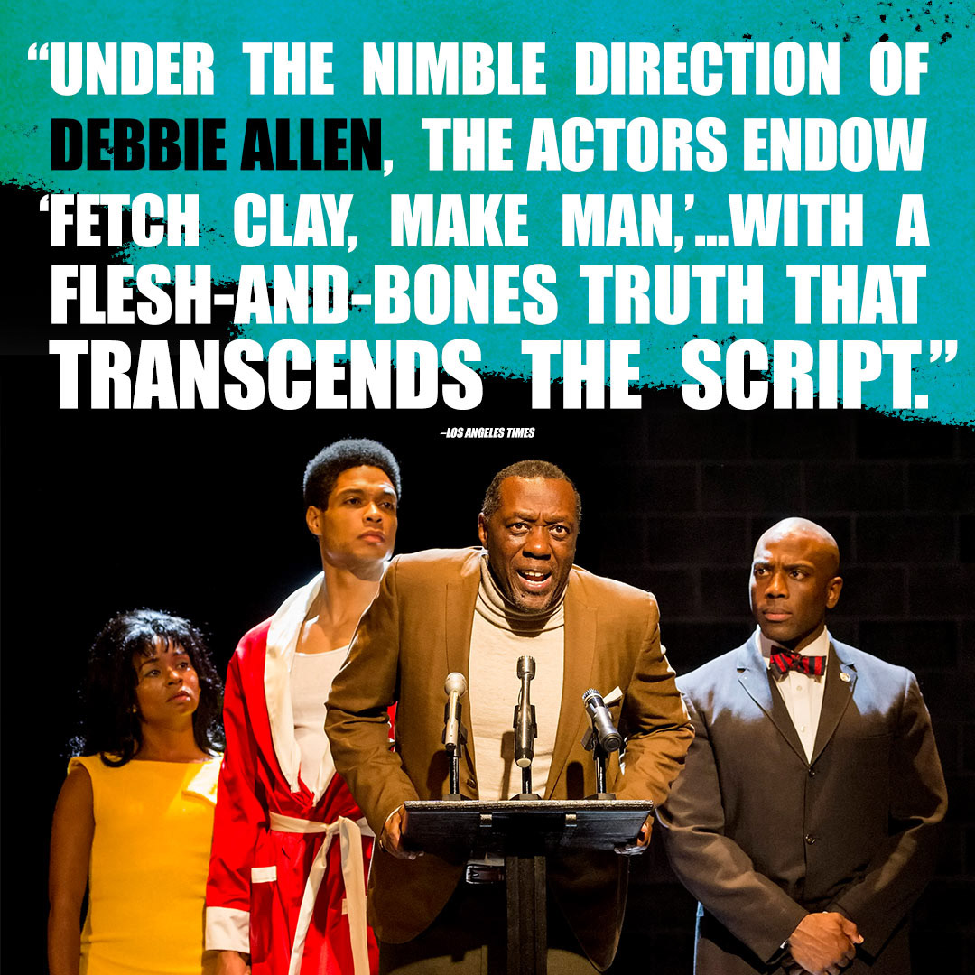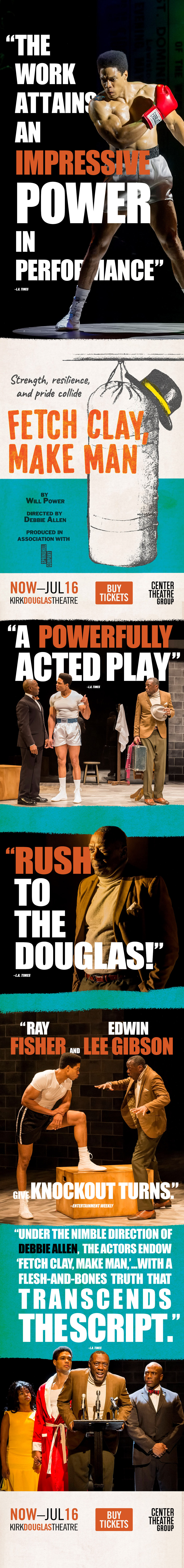 "Fetch Clay, Make Man" at the Kirk Douglas Theatre. Email graphic on the left, followed by graphics for social media.